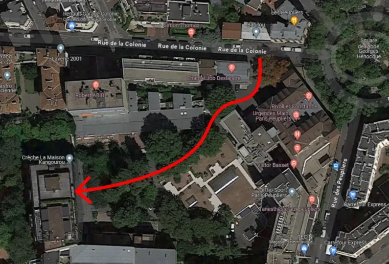 Prendre à droite sur l’arrière de la clinique, puis traverser le jardin.